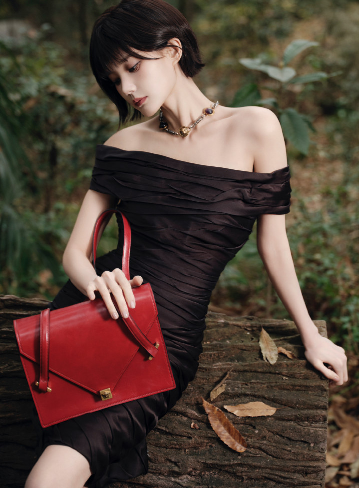 斜裁一字肩巧妙露出肩颈留白,修身剪裁贴合身形轮廓,凸显出纤细腰肢与流畅曲线,将清冷气质演绎到极致。